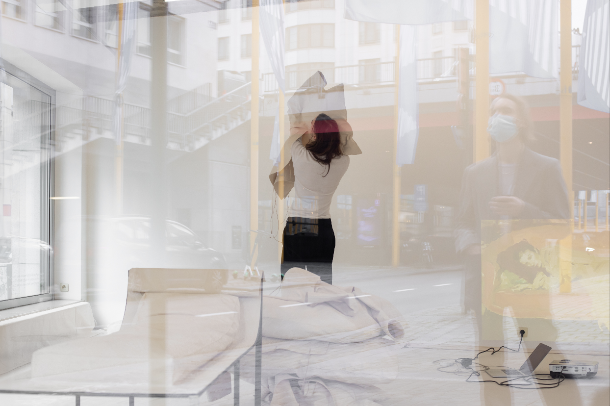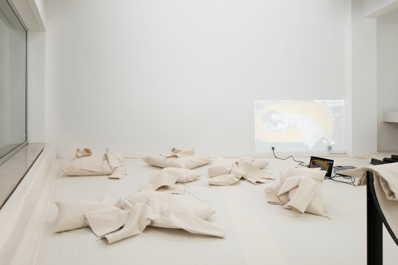 Since beginning this project, I have been collecting references throughout history of women on chaises longues and studying their postures, behaviours, gestures, and their individual uses of the furniture. This all depended on what the society of each period decided was an appropriate way to portray a women’s being, intellect, status and femininity. Always, their bodies were placed delicately, almost draped on the structure that forms the chaise longue, supported only by cushions. So I started to directly translate those postures into wearable canvas sculptures, again cut from one piece. The patterns developed from full scale drawings on the canvas. The moment the sculpture is worn it immediately directs the body to impersonate the corresponding painting or art work. Because the canvas sculptures extract simplified forms from the paintings and art pieces, their historical, class, and gender context becomes more abstract and creates room for personal interpretations and experiences.