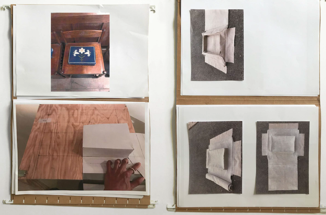 “ My new project started with a chair that I came across in the church of Saint Mary the Virgin in Oxford. The chair was a loose rectangular pillow on a wooden stool. I wanted to find a way to reshape that memory in one piece and make it functional. So by cutting the material in the right places without adding anything, I used a single piece to design the seat of the stool that includes a pillow and covers the overall seat with the minimum amount of seams. On one side, excess material that visually extends the form of the seat can be rolled up or draped over the back of the stool. The stool’s legs can be rotated upward to create a lean, if so desired.